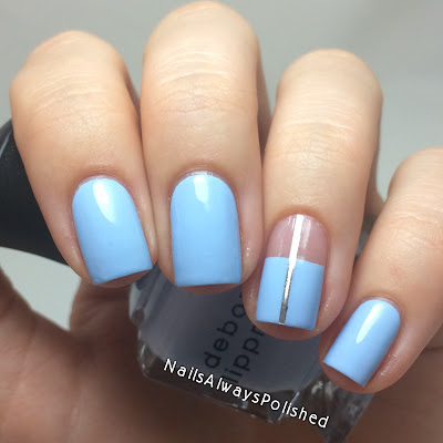 For the manicure I started off with a beautiful blue base of Deborah Lippmann Blue Orchid on all my nails. On my accent nail I only applied Blue Orchid to the bottom part of my nail and added a piece of silver striping tape to finish it off.