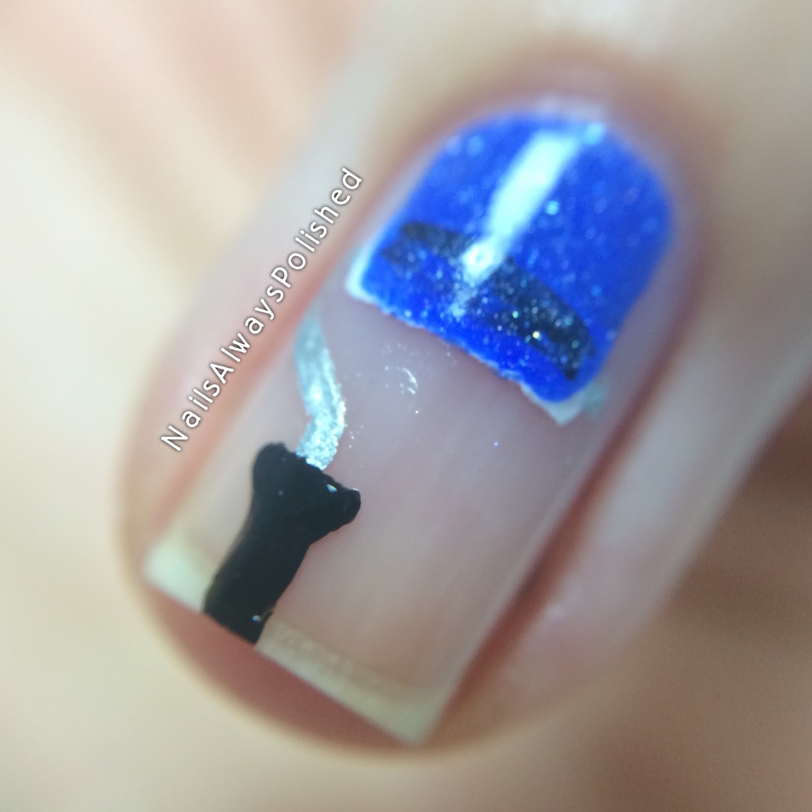 For the manicure I started off with a blue base of piCture pOlish Forget Me Not on my thumb, pointer and middle finger. Afterwards I freehanded the paint roller on my ring finger with a small nail art brush, black and white acrylic paint, the silver polish Essie No Place Like Crome and piCture pOlish Forget Me Not.