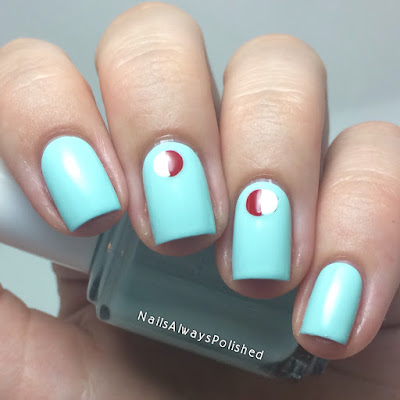 For the manicure I started off with a mint green base of Essie Mint Candy Apple on all my nails. The dots is made with a dotting tool, the red polish Essie Really Red, and the white polish Essence Wild White Ways, by dotting the polishes onto a nail art mat and letting them dry. I then cut the dots in half and placed them on my middle and ring finger.