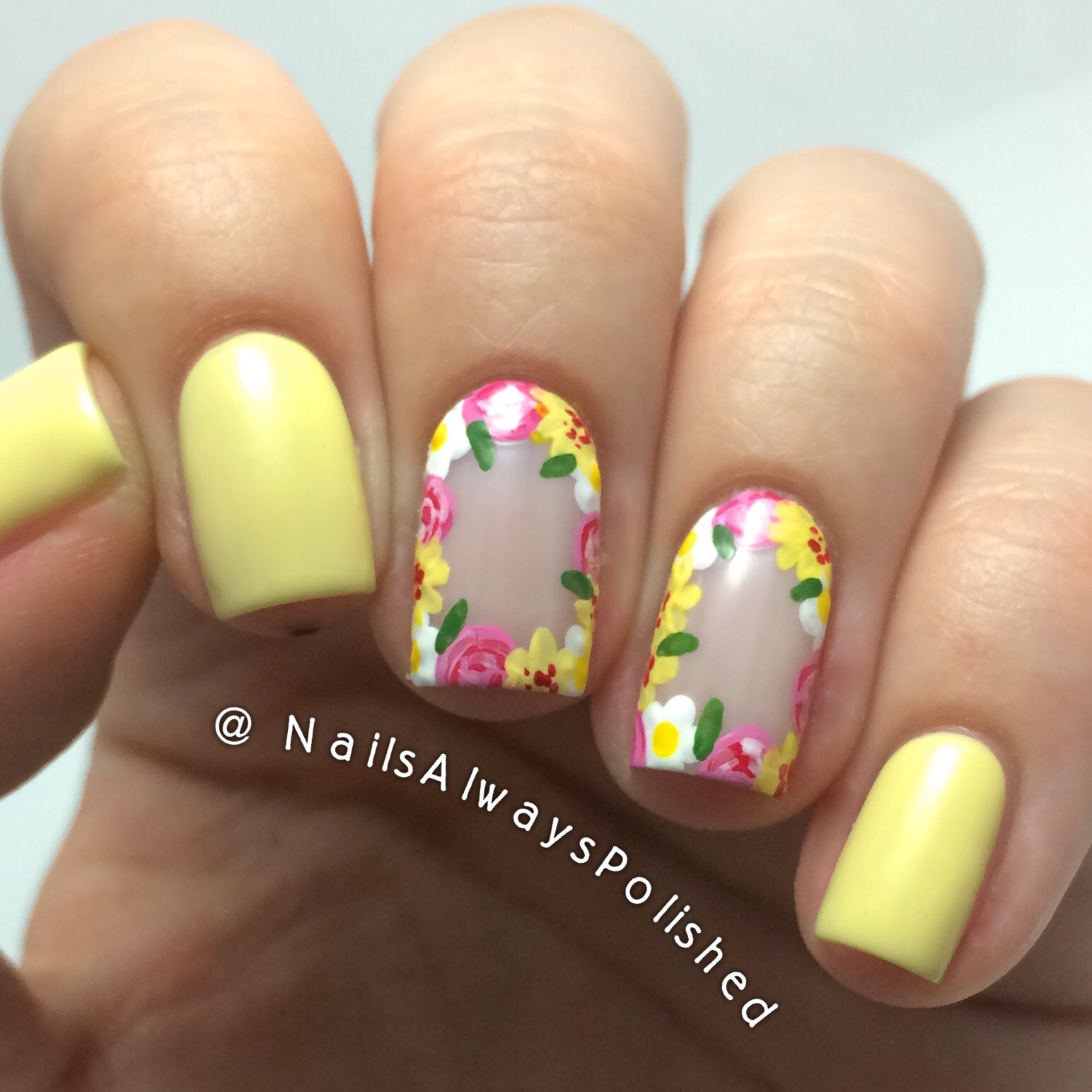 For the manicure I started off with a nude base of Essie Adore-A-Ball on my middle and ring finger and a pale, yellow base of Dior Sunwashed on my other nails. Afterwards I freehanded the flower crowns on my middle and ring finger with acrylic paint and a small nail art brush.