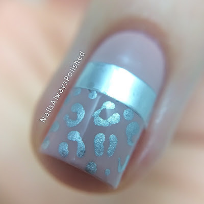 For the manicure I started off with a nude base of Cirque Colors Dakota on all my nails. Afterwards I freehanded the leopard dots on my ring finger with a small dotting tool and the silver polish Essie No Place Like Chrome and applied a piece of silver striping tape across my nail.