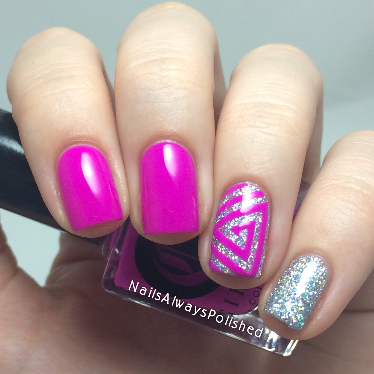For the manicure I started off with a holographic silver glitter base of F.U.N Lacquer 24 Karat Diamond on my ring finger and pinky and with a pink base of Cirque Color Plastik on my other nails. Afterwards I applied a triangle swirl vinyl from Snail Vinyls to my ring finger and used Cirque Color Plastik to finish the look.