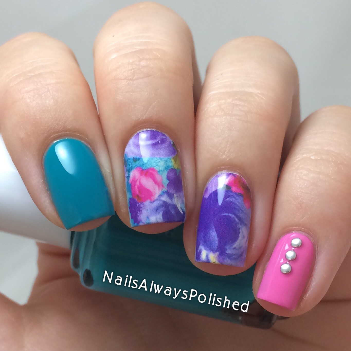 For the manicure I applied a dark teal base of Essie Garden Variety to my thumb and pointer, a white base of CND Cream Puff to my middle and ring finger, and a pink base of Essie Lovie Dovie to my pinky. The floral water decals and small silver studs are from Born Pretty Store.